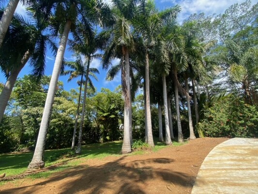 - Features a variety of coconut palms, tropical plants, and fruit trees.